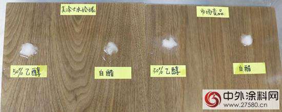 同樣以對比看成效,技術(shù)員取來兩塊黑胡桃木貼皮板以及美涂士水玲瓏水性木器清漆系列和市場競品,對底材進行打磨后分別噴涂兩遍上述兩種水性透明底漆,再噴涂一遍相對應(yīng)的水性透明面漆,在30℃,65%濕度的條件下干燥1天。然后在上述美涂士水玲瓏水性木器清面漆漆膜與市場競品漆膜上分別放上兩團棉花,分別滴上數(shù)滴50%濃度的乙醇及市售白醋,并用膠杯罩住。一個小時候后,移走膠杯和棉花,并用紙巾吸干液體,可以很明顯的看到,美涂士水玲瓏漆膜上被50%乙醇溶液浸泡的區(qū)域只有極其輕微的發(fā)白,被白醋浸泡的區(qū)域則無明顯變化,而競品的漆膜被乙醇溶液和白醋浸泡的區(qū)域則均有發(fā)白。