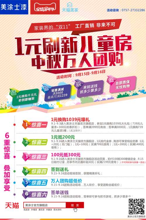 看完攻略,連小編都覺得真是太給力了!但是,還沒完!最強優(yōu)惠還在后面——美涂士漆1元刷新兒童房!