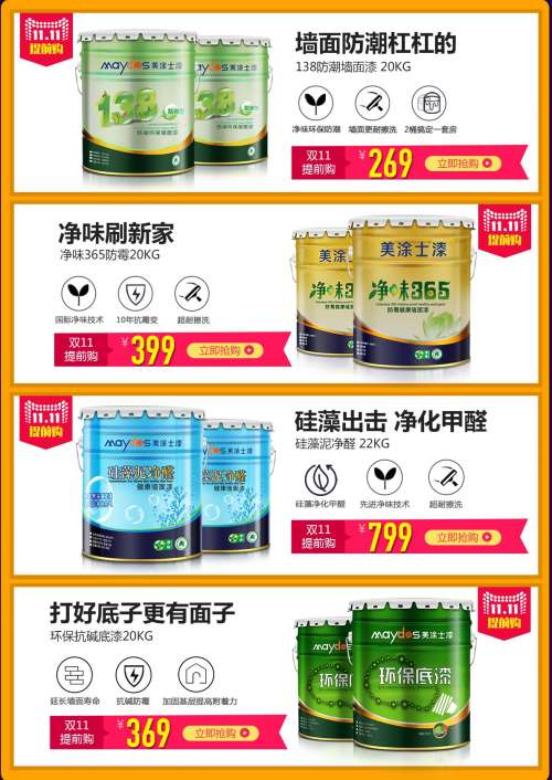 比如美涂士漆天貓官方旗艦店,就在10月20日開啟了雙11的預(yù)售活動(dòng),給業(yè)主提前讓利,早日裝修完工住新家。