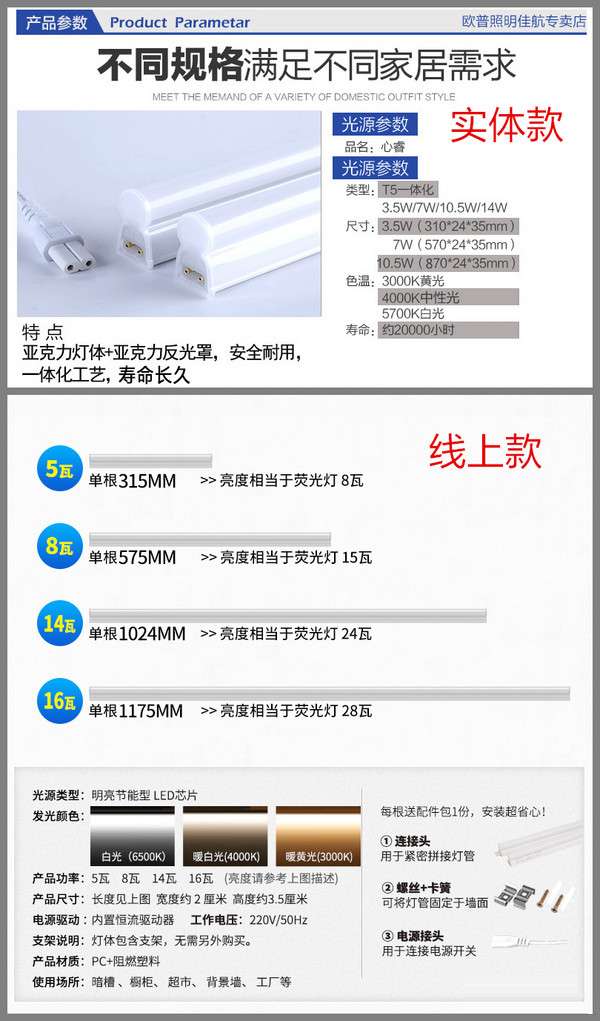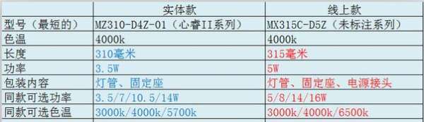 5毫米的長(zhǎng)度差咱先忽略不計(jì),當(dāng)做是同樣長(zhǎng)度的。而功率,兩者足足差了1.5W,線上款理論上更亮。而且在同款中,可選的功率、色溫也不同,線上款功率都會(huì)更大一些。另外,線上款配件還多了一根電源接頭。