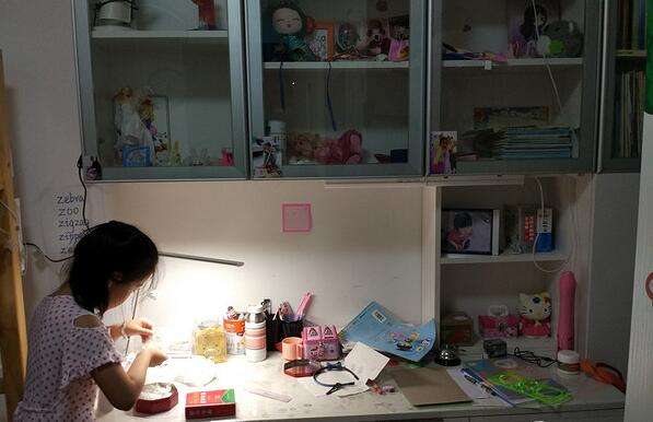 小妞的書桌是他爹我量身定做的,長(zhǎng)度約1.5米。她的臺(tái)燈放左邊只能管約2/3的面積,右邊比較黑。本來小妞自己用是無所謂的,但是由于老二的嬰兒床占了老婆的書桌位子,因此這段時(shí)間懷孕的老婆只好和小妞拼桌子備課。這樣一來,老婆那右邊的亮度就明顯不夠了。