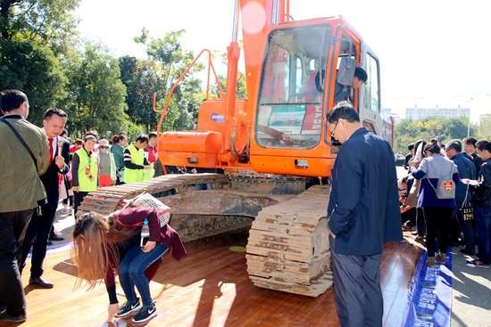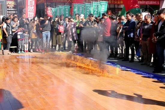 活動的高潮部分在機甲驚天大挑戰環節,在活動現場的西門口,上演了大自然地板挑戰22噸挖掘機和抗擊火燒的破壞性試驗,大自然木地板在挖掘機的重力壓迫下和火燒的摧毀下竟然沒有絲毫損壞之處,讓現場的消費者們大開眼界,紛紛上前端詳撫摸,并表示對購買大自然的木地板十分放心。
