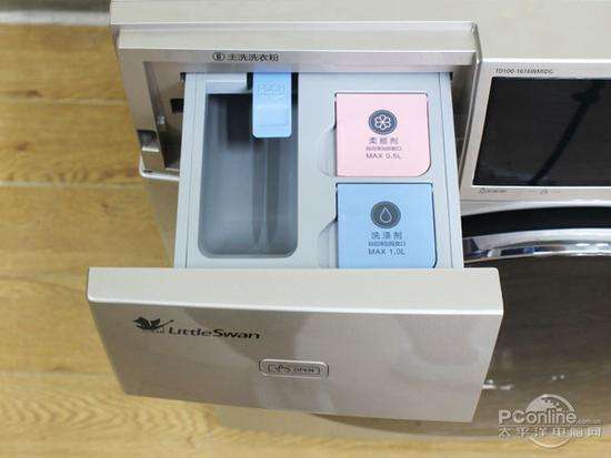 這款小天鵝洗衣機具備自動投放洗滌液的功能,因此我們可以從投放料盒中看到左邊有一條用于手動投放的投放槽,右邊分別有用于自動投放的洗滌劑料盒和柔順劑料盒。洗滌劑料盒一次最多可以存放多達1升的洗滌液,柔順劑料盒則具有0.5升的容量,一次倒入足夠多的洗滌液,接下來的多次洗衣都不需要再加洗滌液了,而且自動投放功能也讓我們不用再糾結(jié)要加多少洗滌液去應(yīng)對不同量不同臟污程度的衣物。
