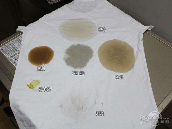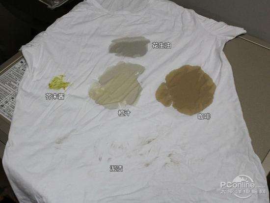 為了測試一下洗凈度,筆者在一件白色T恤上涂上了5種污漬,其中橙汁、咖啡的污漬以及泥漬應(yīng)該是生活中比較容易出現(xiàn)的衣物污漬,看看棉麻模式的洗凈能力如何。