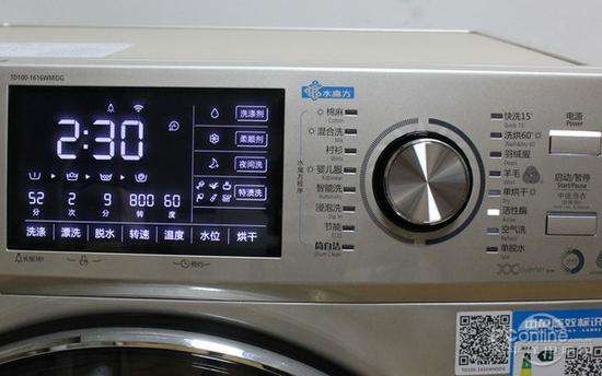 操控區(qū)采用了觸摸屏、旋鈕以及按鈕的搭配,觸控顯示屏主要是提供狀態(tài)顯示以及細(xì)化功能搭配的操作,而旋鈕則主要負(fù)責(zé)洗滌主模式的選擇,兩顆按鍵分別是電源鍵和啟動/暫停按鍵。從整個操作區(qū)可以看出,這臺小天鵝洗衣機的洗滌模式非常豐富,功能足夠全面,觸摸屏的操作也增加了整機的科技感。
