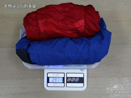 三件衣物浸濕后的重量為2971克,接下來的脫水測試也將針對這個重量去做對比。