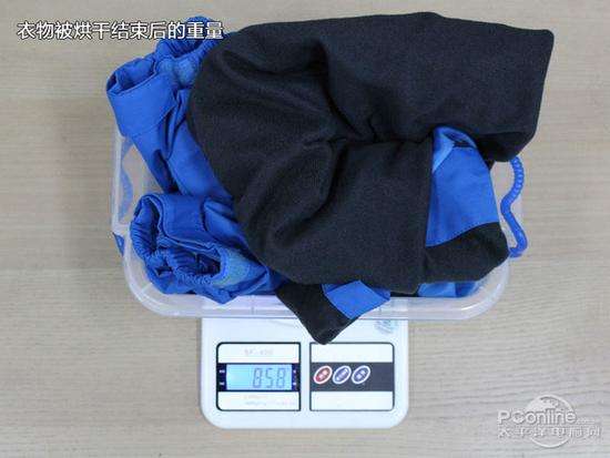 烘干過程結(jié)束后,衣物的重量為858克,基本與干燥狀態(tài)下的856克吻合,衣物的內(nèi)絨也被完全烘干,真正達到了即干即穿的狀態(tài)。