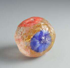 這枚三彩玻璃馬球,色澤鮮艷,晶瑩剔透,小巧玲瓏。球體呈圓形,上面繪有黃、紅、藍(lán)三種顏色,色彩斑斕,球體內(nèi)部的花紋如行云,似流水,三種不同顏色,更如同三顆晶瑩的寶石鑲嵌在球體之上,使之耀眼奪目,憑添了幾分色彩。