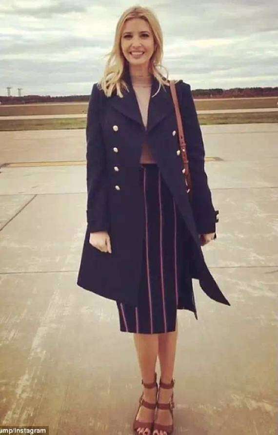 川普的女兒Ivanka Trump也選擇身著一件海軍風雙排扣大衣在instagram向大家問好。