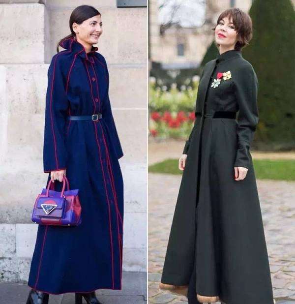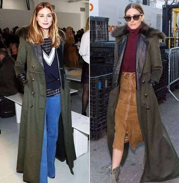 Olivia曾經穿過一件超長款軍裝風的大衣裙,帥氣有型。