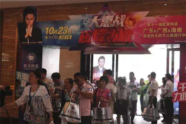 10月23日,歐美陶瓷在廣大業(yè)主朋友們千呼萬喚,熱切期盼的目光中,迎來了【大惠戰(zhàn)巔峰對(duì)決】——第十一屆歐美陶瓷廣東&廣西&海南廠家瓷磚采購節(jié),在歐美陶瓷營(yíng)銷中心盛大開演。活動(dòng)當(dāng)日,現(xiàn)場(chǎng)人聲鼎沸,熙熙攘攘,三省業(yè)主共同享受這次歐美陶瓷帶來的盛惠。