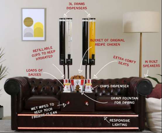 上校沙發中間的島臺給原味雞、薯條、醬汁和飲料都設置了各自的位置,還內置4個3L軟飲分配器、濕紙巾、甚至是夢幻肉汁噴泉。