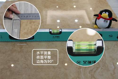 小編現(xiàn)場通過水平測量儀對這款羅馬御石瓷磚進(jìn)行測量,結(jié)果發(fā)現(xiàn)氣泡觀察窗中的氣泡觀水平居中,無任何偏向,說明該款瓷磚十分平整。再用直角尺對瓷磚邊角進(jìn)行測量,直角尺與瓷磚邊角無縫緊密相貼,由此可見,蒙娜麗莎羅馬御石瓷磚線條筆直,邊角為直角。