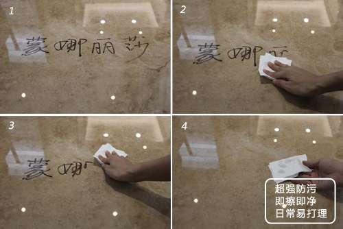 小編用油性筆在羅馬御石瓷磚的磚面上寫上“蒙娜麗莎”字樣,靜待幾分鐘后,用紙巾輕輕擦拭就能將字跡輕松地處理干凈,不需要任何洗滌劑,可見這款瓷磚的防污性較好。