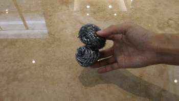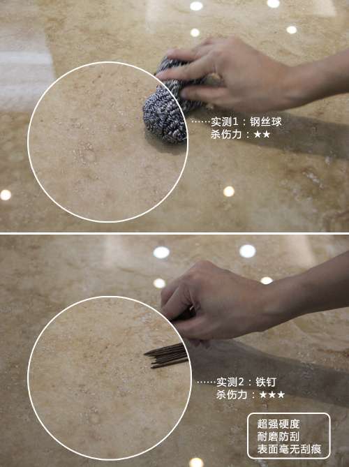 耐磨性是瓷磚的重要檢測項目,倘若耐磨性不過關(guān),使用一段時間后瓷磚表面就容易出現(xiàn)很多劃痕,從而影響視覺效果。小編分別用鋼絲球摩擦和鐵釘在瓷磚表面用力刮劃,發(fā)現(xiàn)瓷磚表面沒有任何刮痕,依然光滑如新,可見這款瓷磚的耐磨性能優(yōu)秀,遠(yuǎn)高于天然大理石。
