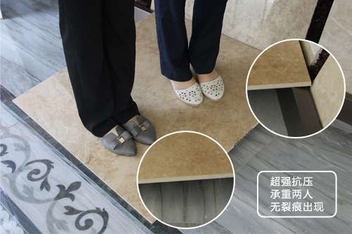 磚體的致密度高,則意味著瓷化程度高。瓷化程度高的瓷磚,更加耐用、抗壓,不易出現(xiàn)斷裂等情況。蒙娜麗莎羅馬御石系列產(chǎn)品具有天然石材的硬度和耐久的特性,抗彎強(qiáng)度可達(dá)到43Mpa。在此,小編邀請2名成年女子站立于磚面上,瓷磚并沒有出現(xiàn)彎折、碎裂的跡象,說明該款瓷磚的致密度好,抗壓性強(qiáng)。