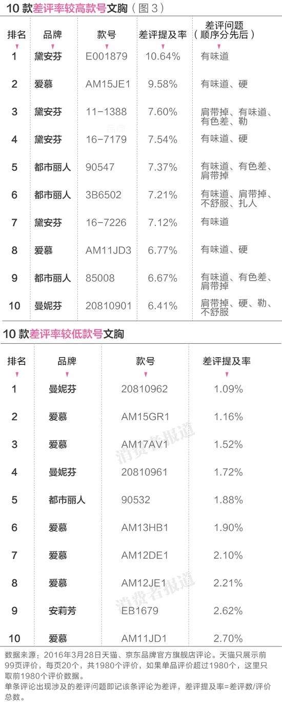除了整體品牌之外,具體型號(hào)的槽點(diǎn)也不盡相同。本刊列出了此次對(duì)比的84款文胸中差評(píng)占比較高的和較低的十款文胸,供消費(fèi)者具體參考。(如圖3)
