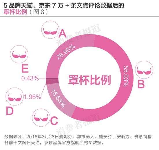 《消費(fèi)者報(bào)道》試圖以小見(jiàn)大,通過(guò)在曼妮芬、都市麗人、黛安芬、安莉芳、愛(ài)慕五品牌在天貓,京東的官方旗艦店七萬(wàn)多條購(gòu)買(mǎi)數(shù)據(jù),分析女性對(duì)文胸的“色”取向和罩杯大小。