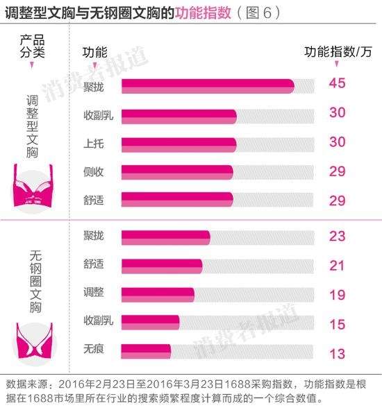 2016年3月阿里指數(shù)顯示,不論無(wú)鋼圈文胸,還是調(diào)整型文胸,“聚攏”都是最重要的功能需求。(如圖6)