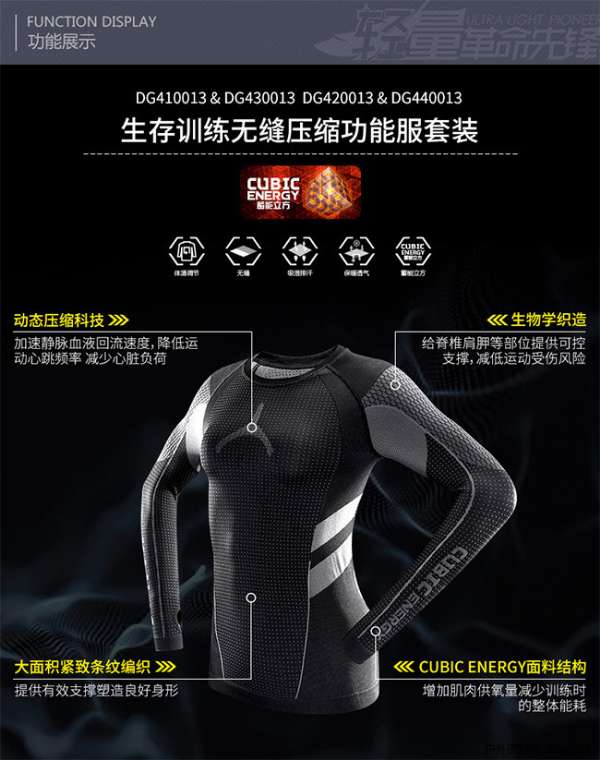 普通的壓縮衣褲,注重的是對(duì)穿著者肌肉的壓縮,提高爆發(fā)力,增加透氣性,緩沖肌肉因運(yùn)動(dòng)時(shí)的沖擊力,而這款生存訓(xùn)練套裝不但具備壓縮衣的所有功能,同時(shí)保證穿著者的透氣性,具有速干,保暖的作用,更有