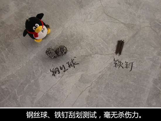 瓷磚毫無(wú)殺傷力,瓷磚表面并沒(méi)有任何被刮花的痕跡,可見(jiàn)這款瓷磚的耐磨性能優(yōu)秀。