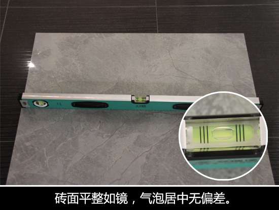 瓷磚平整時(shí),水平儀中間觀察窗的氣泡會(huì)處于居中的位置,無(wú)任何偏向。經(jīng)小編測(cè)量發(fā)現(xiàn),氣泡居中無(wú)偏向,證明這款原石