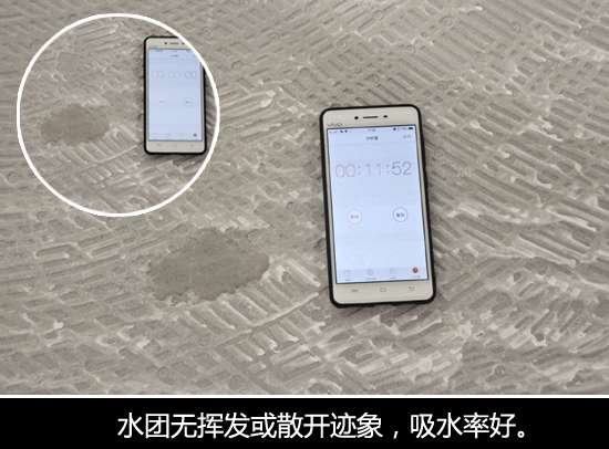 吸水率是指石材在標(biāo)準(zhǔn)大氣壓力下吸水的能力。石材的吸水率是由其中空隙的數(shù)量和大小、顆粒相互排列的方式等因素決定。吸水率越小的石材越緊密堅(jiān)硬,水團(tuán)不容易揮發(fā)或散開。小編將水倒在瓷磚背面,靜待十多分鐘后發(fā)現(xiàn),水團(tuán)并無(wú)散開或揮發(fā)的現(xiàn)象,可見(jiàn)這款瓷磚的防水防潮性十分好。