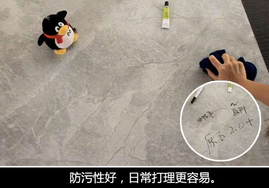 如果瓷磚的抗污性差,必定對(duì)日常的保養(yǎng)與清潔產(chǎn)生極高難度,同時(shí)也會(huì)影響用戶的使用效果與使用體驗(yàn)。小編通過(guò)用油性筆在磚面上寫字的方法測(cè)試發(fā)現(xiàn),只需用抹布輕輕擦拭就能將字跡輕松地處理干凈,不需要任何洗滌劑。