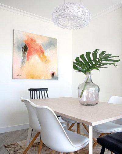 小餐廳的設計些許素雅,原木色和白色的運用讓這個小小的空間顯得干凈整潔,墻上一幅意象派裝飾畫也提高了餐廳的檔次。