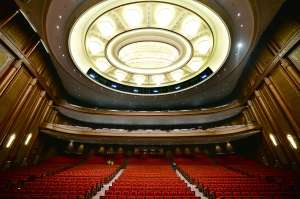 打開古銅色大門,可以看到大劇院的共享大廳,抬頭看,房頂呈水滴狀暈開。沿著引導(dǎo)牌走,左手邊是歌劇廳和音樂(lè)廳,右手邊是綜藝廳和戲劇廳。