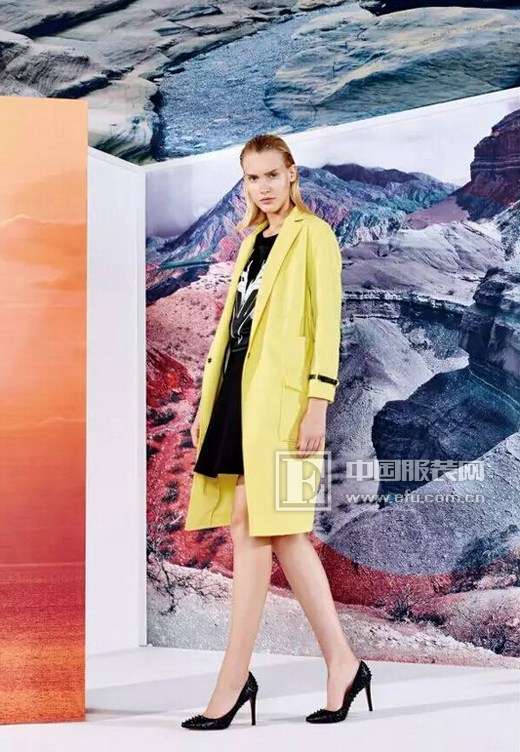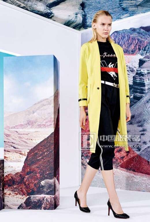 【LOOK5】明黃色的風(fēng)衣給早春帶來了與眾不同的色彩,經(jīng)典簡約的修身廓形,易搭配,面料彈力感好,光澤感豐富,內(nèi)搭時尚花型與珠片繡的設(shè)計小衫和錐形褲,都是2016春季絕對要入手的物件。