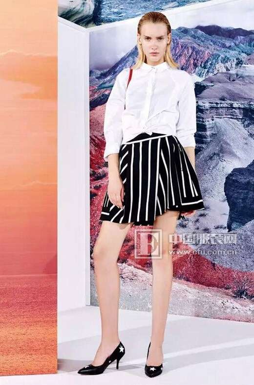 【LOOK4】極致干凈達(dá)練的白襯衫,與百搭黑白條紋小A型半裙組合,恰到好處拉長身材線條,展現(xiàn)了女性俏皮之美。