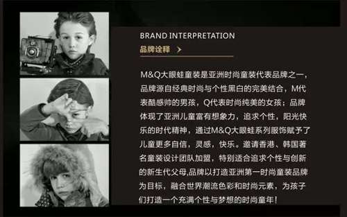 童裝是亞洲時(shí)尚童裝代表品牌之一,產(chǎn)品圍繞“時(shí)尚”、“帥氣”、“炫麗”系列打造,邀請(qǐng)香港、韓國著名童裝設(shè)計(jì)團(tuán)隊(duì)加盟,特別適合追求個(gè)性與創(chuàng)新的新生代父母的審美觀,品牌以打造亞洲第一時(shí)尚童裝品牌為目標(biāo),融合世界潮流色彩和時(shí)尚元素,為孩子們打造一個(gè)充滿個(gè)性與夢(mèng)想的時(shí)尚童年!