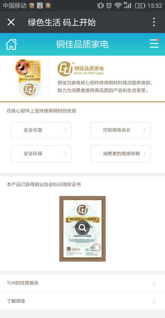 首先,信息平臺會告訴你這款家用電器到底哪個核心零部件使用了銅材料,以及使用銅材料后,這款產品具備了哪些優良品質,例如,安全可靠、耐用壽命長、安全環保等。此外,銅佳標識鏈接的信息平臺會展示該型號產品獲得的“國際銅業協會標識授權證書”和“第三方權威檢測機構TUV的材質檢測報告”。