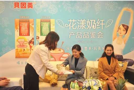 在感受企業(yè)文化的同時,貝因美員工拿出了專為女性設(shè)計的沖調(diào)飲品“花漾奶纖”來請華姐品鑒,清新淡雅的口味得到了華姐的一致好評。