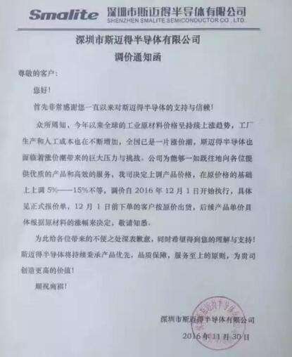 本以為是LED常年價格戰競爭的良性回歸,但是,2016年下半年以來,隨著線路板、金線等原材料的連續大幅上漲,以及人工、房租成本的增加,即使行業競爭再激烈,封裝廠也開始不得不從價格戰轉向價值戰,漲價變得勢在必行。斯邁得、鴻利、晶科、旭宇等幾大封裝廠選擇在12月開局之時集體提價,成為業界關注的焦點。
