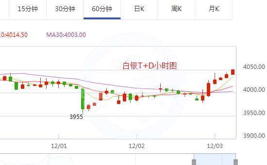 從白銀T+D小時圖的走勢可以看到,銀價強勢反彈,目前逼近4050關(guān)口,上方仍舊存在4100這一整數(shù)關(guān)口。技術(shù)面上看,銀價獲得一定反彈動能,但是下行壓力依舊較大。