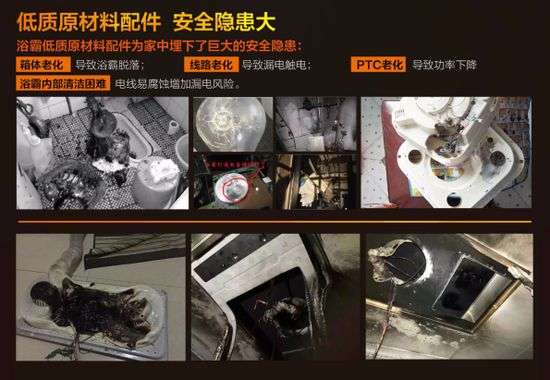 劣質(zhì)的浴室取暖電器在生產(chǎn)材料和產(chǎn)品性能方面都存在著嚴(yán)重的安全隱患,取暖燈泡不防爆、機(jī)箱零件材料不阻燃等都是引發(fā)事故的主要原因。