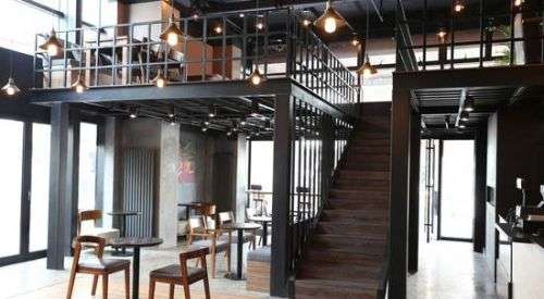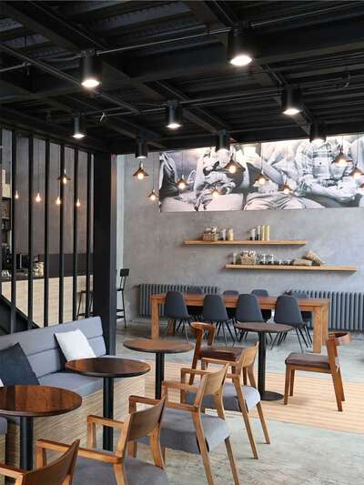 兩層的空間,一樓為大型公共區(qū),并向外延伸與露臺連接。公共區(qū)包含服務(wù)區(qū),收銀臺等。設(shè)置了大型的多人木桌,同時(shí),在夾層下方區(qū)域,擺放雙人咖啡桌椅,明確劃分商務(wù)區(qū)與休閑區(qū),呈現(xiàn)出多樣的空間氛圍。碳鋼樓梯 裝修效果圖)則將一層與夾層連接,由此進(jìn)入安靜的上層區(qū)域。