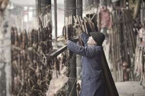 初冬一到,紹興人便紛紛開始制作臘腸,而安昌臘腸則是其中的代表。每到冬令時節(jié),在安昌老街上,家家戶戶的沿街廊坊下都掛滿了臘腸。初冬是阿勇一家相對忙碌的時節(jié),因為他家制作的臘腸在安昌小有名氣。除了自家食用,和很多安昌人一樣,阿勇會把多余的臘腸拿到集市售賣以補貼家用。