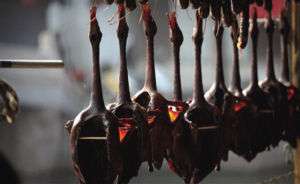 醬鴨一般是每年立冬之后至立春之前腌制,紹興人常常在小雪節(jié)氣之后便著手腌制醬鴨。在齊賢鎮(zhèn)老街,老房子的屋檐下都已經(jīng)掛滿了醬鴨。房主王大伯今年62歲,是地道的老紹興人,按他的話說,只要是老紹興人,誰不會做醬鴨呢?