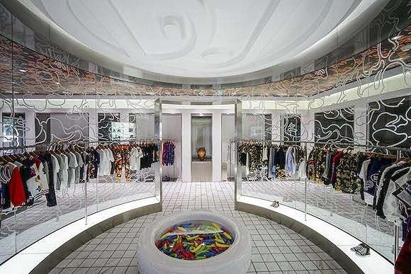 如果說去城中門店消費(fèi)的顧客以男性“潮人”居多,那么迪士尼小鎮(zhèn)的分店能讓更多人關(guān)注并購買品牌的其它產(chǎn)品線,尤其是配飾和童裝線。以BAPE為例,走進(jìn)BAPE的迪士尼小鎮(zhèn)分店,就會(huì)發(fā)現(xiàn)這里與其它BAPE專賣店最大的不同是,店里少了許多暗黑的門店設(shè)計(jì)元素,而BAPE的兒童線形象BABY MILO在店里出現(xiàn)頻率頗高。整個(gè)店的中心還擺著一個(gè)香蕉池,讓進(jìn)店的顧客能感覺到滿滿的童趣。
