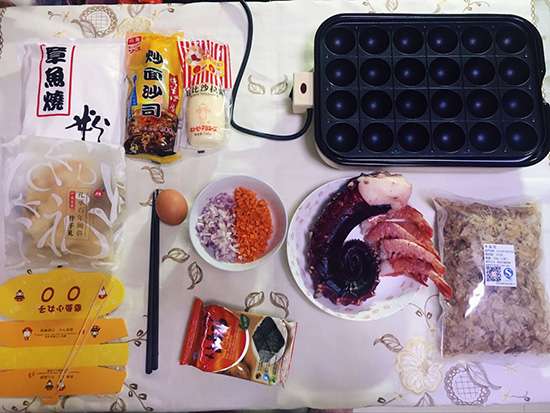 小編一邊兒咂摸著滋味兒一邊兒琢磨,好吃歸好吃,但是太貴了吧!不如在家試著做做?沒準以后還能當個創收手段呢~說干咱就干,這里必須要感嘆一下網絡的強大,配方分分鐘到手,再從網上買齊食材和工具:章魚燒粉,照燒醬汁,蛋黃醬,木魚花,章魚腿,大蝦,雞蛋,洋蔥和胡蘿卜碎,魚干,章魚小丸子鍋,尖頭筷子。一切準備就緒!