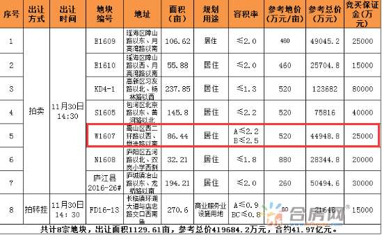 蜀山W1607號(hào)地塊位于蜀山區(qū)西二環(huán)路以西、樊洼路以南,出讓面積計(jì)價(jià)面積:86.44畝,其中:發(fā)證面積:80.44畝,規(guī)劃用途為居住,出讓年限70年,容積率A地塊≤2.2;B地塊≤2.5,綠地率≥40%,建筑密度≤20%,參考地價(jià)520萬(wàn)/畝,競(jìng)買(mǎi)保證金2.5億元。
