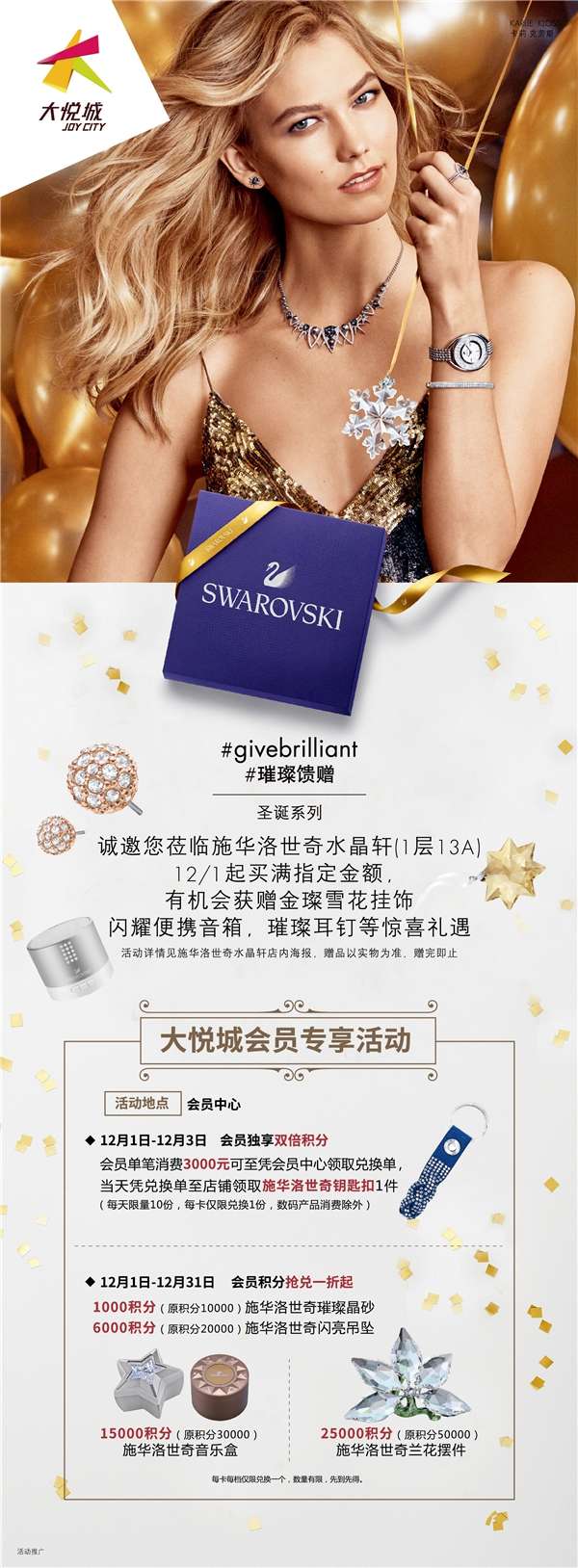 今年的璀璨圣誕樹,以施華洛世奇2016秋冬“晶璨銀河”系列FIZZY項鏈為靈感,在傳統(tǒng)圣誕樹基礎(chǔ)形狀之上,將一顆顆晶瑩剔透的繁星錯落有致地懸掛于高達14米的樹身,炫彩光芒,燦若星空。金色底座、金色氣球和緞帶裝飾帶來喜悅的節(jié)日氛圍;銀色流線型LED燈帶盤旋而上,與數(shù)十萬顆鑲嵌仿水晶、仿水晶串珠相映生輝;樹冠的2016限量雪花造型更顯明澈澄湛。12月1日至1月3日期間,每天14點到21點期間逢整點,“璀璨圣誕樹”都將準時點亮。星雨閃爍,光影灼灼,優(yōu)雅絢麗的首飾與光影幻燈曼妙結(jié)合,承載希望,傳遞祝福,為這個圣誕帶來別具一格的美妙體驗!