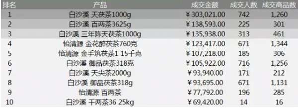 白沙溪和怡清源這兩個傳統(tǒng)黑茶品牌茶企,瓜分了黑茶類單品成交的top10。白沙溪獨占7席。