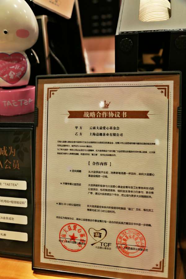 每售出一杯茶,即向大益愛心基金會捐出一分錢。