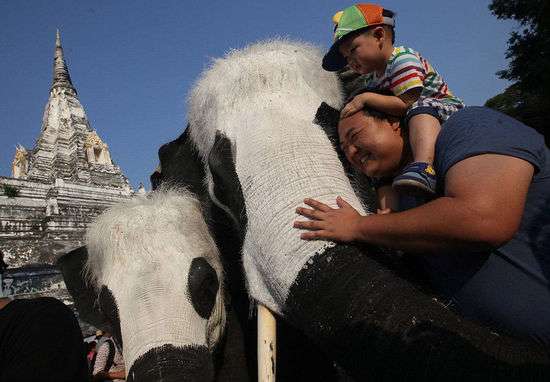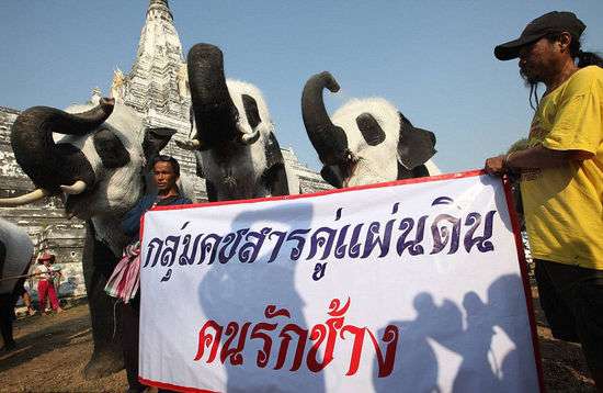 大象組織Elephantstay日前在泰國南部大城府(Ayutthaya)皇家象園村舉行了名為“1600只熊貓”的國際設計展覽,此次展覽中,Elephantstay工作人員將3頭大象扮成了熊貓模樣成功吸引了游客們的眼球。