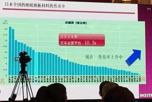 日本池見林產(chǎn)株式會(huì)社總裁久津輪光一先生發(fā)表《日本地?zé)岬匕灏l(fā)展現(xiàn)狀及發(fā)展趨勢(shì)》主題演講。久津輪光一先生指出,2014年日本全國(guó)的地暖地板材料普及率平均10.3%,現(xiàn)在普及率呈逐年上升態(tài)勢(shì)。