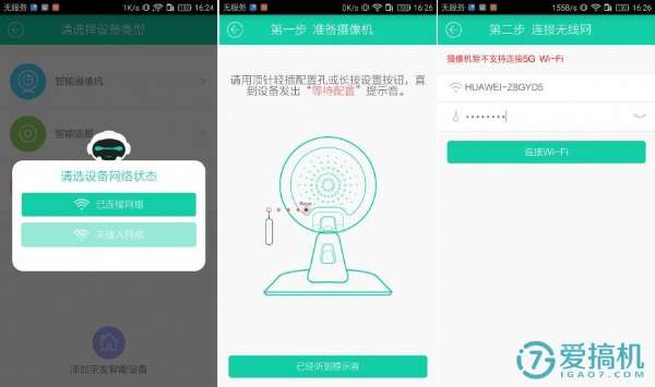 之后會出現(xiàn)如上圖片的彈窗,新用戶選擇 “未接入網(wǎng)絡(luò)”選項(xiàng),按照操作提示依次進(jìn)行。此處應(yīng)該注意,圖片長按設(shè)置鍵按鈕這是示意圖,具體設(shè)置鍵的位置以具實(shí)物機(jī)型為主,例如智能攝像機(jī)C5的RESET鍵位于云臺后側(cè)。第二步選擇接入的無線網(wǎng)絡(luò),大家選擇網(wǎng)絡(luò)時(shí)一定注意云視通智能攝像機(jī)C5不支持5G wifi,切記不可選錯(cuò),否則無法綁定。